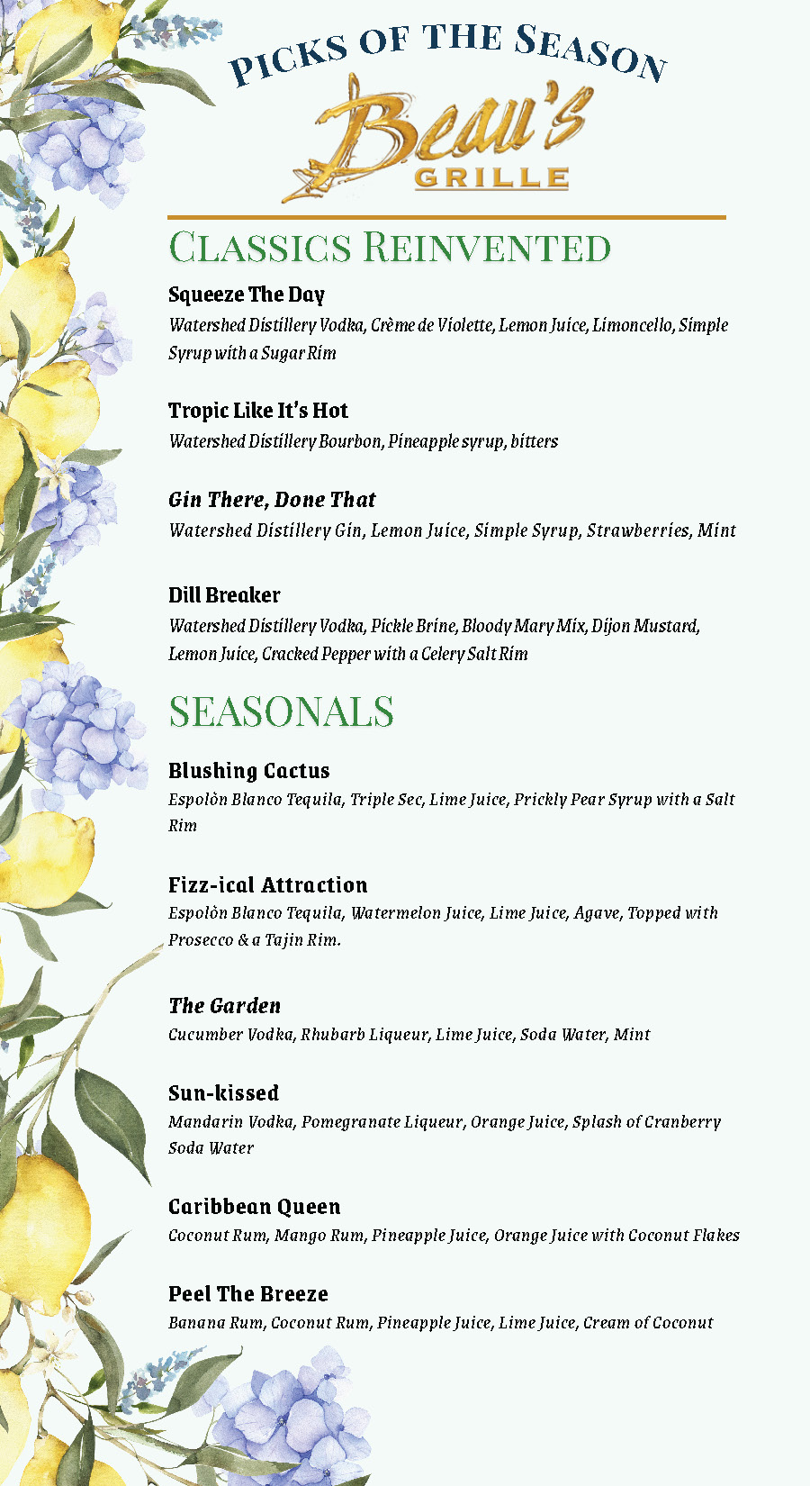 Please fill out the form to get Beau’s Grille Restaurant’s special promotions for seasonal events, weekly lounge specials, and more.